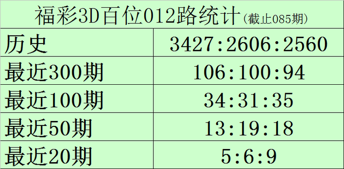 百位推选:百位最近20期号码012路比为5:6:9,当今0路号码遗漏3期,1路号码遗漏0期,2路号码遗漏2期,另外0-9号码遗漏期数折柳为: