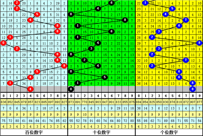 百位上期出现:温号1,该位贯穿十期以温号出现较多,以冷号出现较少,当今百位热号有5个:1、4、5、8、9,本期看好开出热号再次出现,参考号码4。