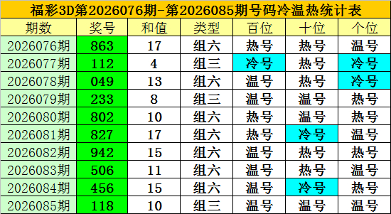 上期总结:福彩3D第2026085期开奖奖号为:118,奖号类型为:组三,奖号冷温热态为:温号+温号+温号。