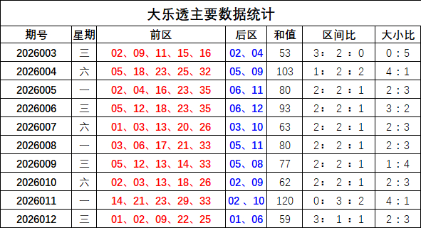 前区和值分析:上期开出和值59,近10期和值在53-120之间,近十期和值平均值是79,本期预测和值有上升趋势,关注和值出现在95-100区间。