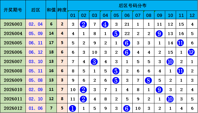 后区综合分析:上期开出后区号码:01 06,跨度5,较前一期相比跨度下降3个点位。本期预测跨度值下降,推荐号码:05 08,跨度3。
