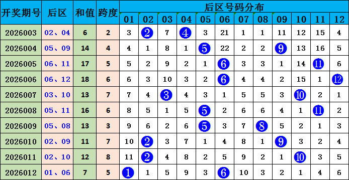 后区分析:大乐透后区上期开出奇偶组合,跨度5。近10期后区奇偶组合出现2期,偶奇组合出现2期,奇奇组合出现2期,偶偶组合出现3期;近10期后区两码跨度1-5开出4次,6-11开出5次,本期后区两码综合推荐:01、07。