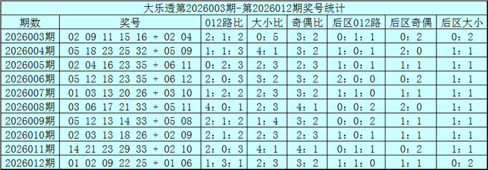 赵研大乐透第2026013期奖号012路分析: