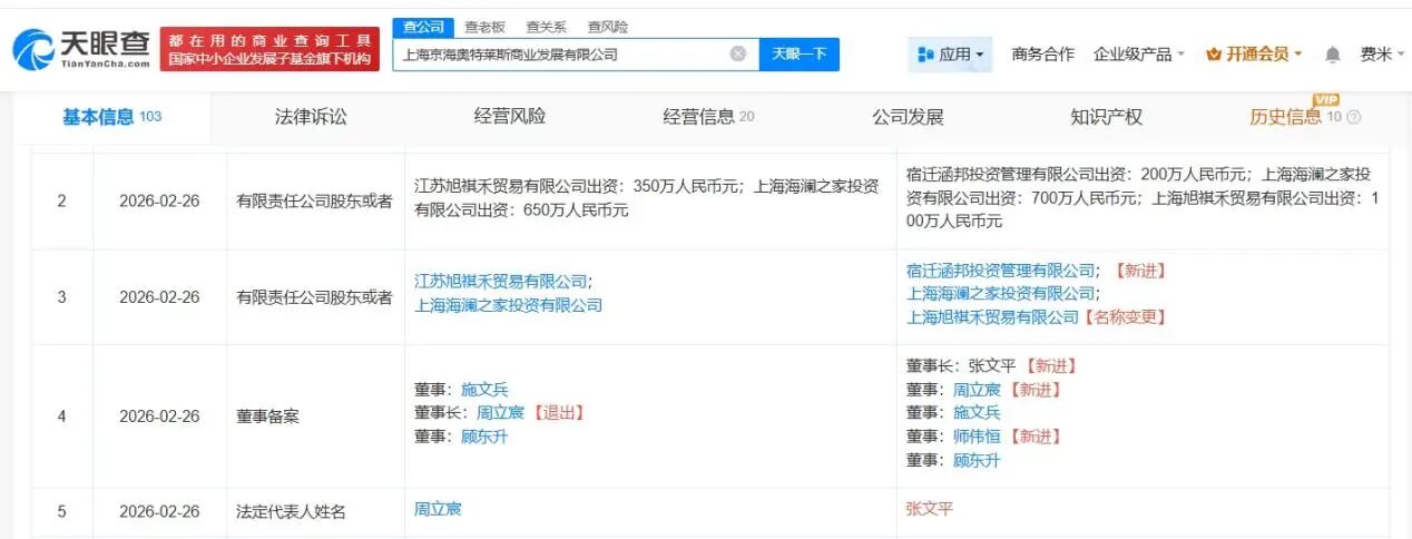 天眼查工商信息披露,近日,上海京海奥特莱斯交易发展有限公司发生工商变更,新增京东旗下宿迁涵邦投资处理有限公司为推动,配资网址同期,周立宸卸任法定代表东说念主、董事长,由张文平接任。