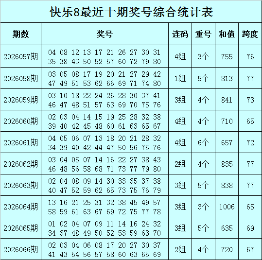 福彩鼎沸8第2026066期开出奖号:02 03 04 06 08 17 20 27 30 37 41 43 54 56 57 58 60 63 65 69,其中奖号和值为720,跨度为67,包含4个重号02、04、37、63,包含连码02 03 04、56 57 58。