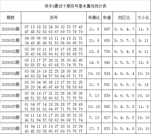 福彩快乐8第2026029期开出奖号:01 04 11 15 19 27 29 31 33 39 43 45 52 58 65 67 69 73 75 77,其中奖号奇偶比为17:3,和值为833,跨度76,四区比为5:5:4:6。