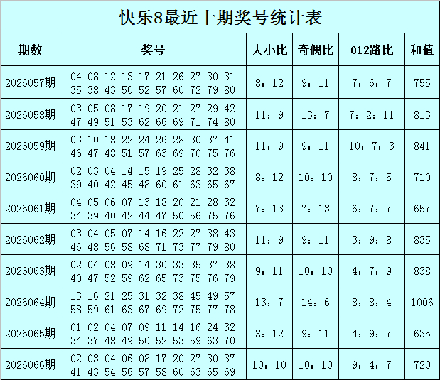 福彩情状8第2026066期开奖追想:02 03 04 06 08 17 20 27 30 37 41 43 54 56 57 58 60 63 65 69,其中奖号奇偶比开出10:10,大小比开出10:10,012路比开出9:4:7,和值为720,跨度为67。