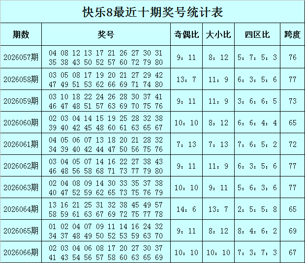 福彩舒畅8第2026066期开奖回顾:02 03 04 06 08 17 20 27 30 37 41 43 54 56 57 58 60 63 65 69,其中奖号奇偶比开出10:10,大小比开出10:10,四区比开出7:3:7:3,跨度开出67。