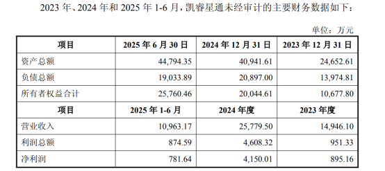 适度2025年6月30日,凯睿星通钞票总和4.48亿元,通盘者权利共计2.58亿元。2025年上半年,凯睿星通完毕营收1.1亿元,净利润781.64万元。